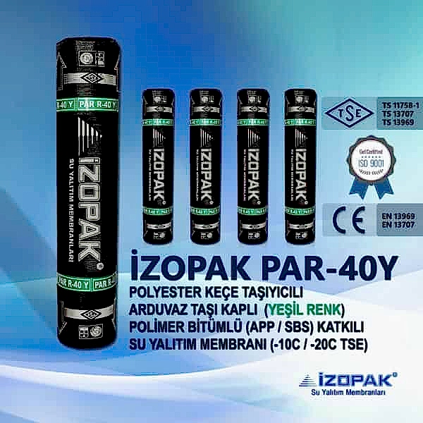 PAR-40Y Arduaz taşı kaplı polyester keçeli bitümlü su yalıtım membranı , polyester keçenin APP (Atactic Polypropylene) katkılı bitum penetrasyon asfaltın kaplanması ile elde edilir. Bir yüzü polietilen film kaplama diğer yüz arduaz mineral taş ile kaplanan polyester keçeli membran son işlem ile elde edilir. PAR-40Y arduazlı membran polyester keçeli su yalıtım membranı genel olarak çatılarda, pergule ve su yalıtım izolasyonu gerektiren yalıtım noktalarında kullanır.